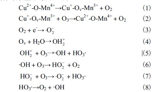 Cu 摻雜會(huì)增加比表面積,改變化學(xué)鍵,并促進(jìn)多價(jià)金屬的轉(zhuǎn)化和氧空位的產(chǎn)生[12].加入Ce 后,催化劑中的小半徑的Cu-Mn 取代了CeO2 中的大半徑的Ce,進(jìn)入到CeO2晶格中,從而產(chǎn)生很多的表面空位,形成缺陷結(jié)構(gòu),加快了供氧速度,從而提高了催化劑活性,促進(jìn)對(duì)O3的轉(zhuǎn)化率[13–14].Mn 與Cu 的氧化物復(fù)配會(huì)產(chǎn)生錳銅固溶體,從而導(dǎo)致晶格氧的缺陷,有效地改善了催化劑吸附和活化氧的能力,并且通過(guò)兩者的復(fù)配形成的銅錳尖晶石將進(jìn)一步提高催化劑的活性,原理見(jiàn)式(1)—(8).