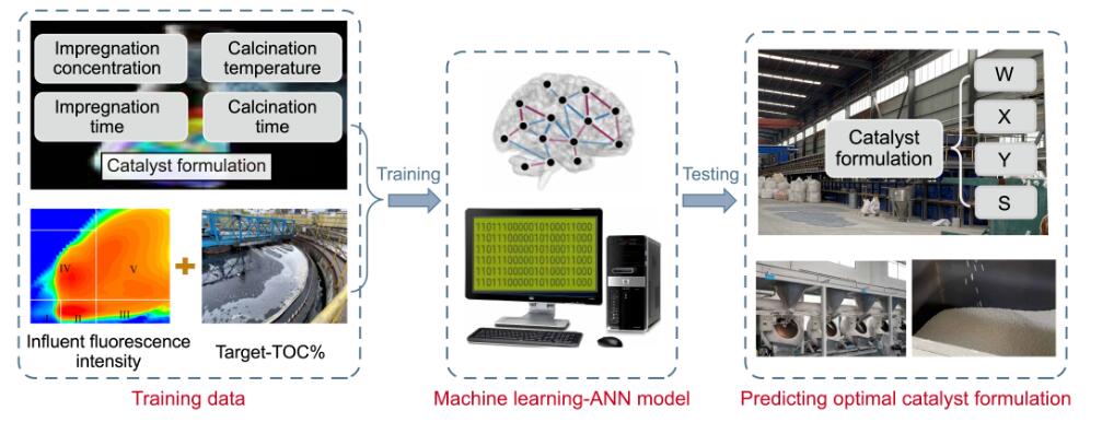 催化臭氧氧化因其對難降解有機物的礦化性強而被廣泛用于廢水深度處理。而在實際廢水中,不同臭氧催化劑對不同有機物的降解表現出差異性,影響因素復雜。因此,高礦化的關鍵在于催化劑配方與廢水水質的適配性。機器學習可以大大提高實驗效率,而熒光數據可以提供廢水水質中關于有機物組成和濃度的信息,有利于催化劑配方的優化。本研究采用機器學習(ANN,人工神經網絡模型)并結合熒光光譜技術,開發了適配于目標廢水的臭氧催化劑(圖1)。