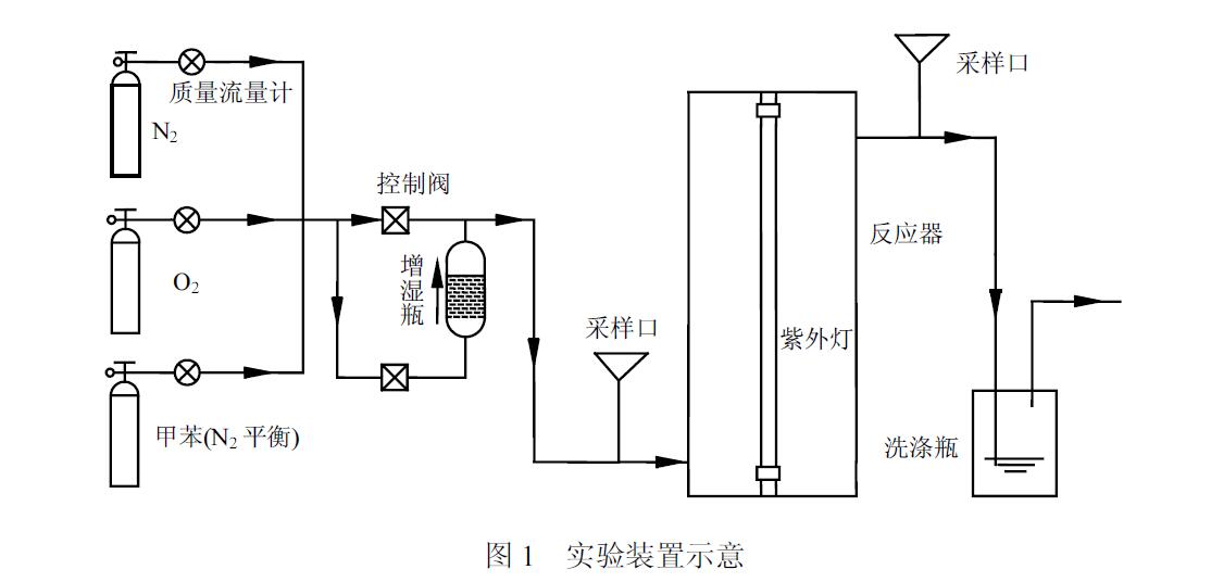 甲苯是一種導(dǎo)致大氣光化學(xué)污染以及對(duì)人體健康造成毒害作用的典型揮發(fā)性有機(jī)物,城市大氣環(huán)境中甲苯濃度約為幾到幾十個(gè)μg/m3.機(jī)動(dòng)車排放、工業(yè)過程、建筑涂裝、餐飲油煙等均是大氣中甲苯的來源.此外,甲苯作為室內(nèi)污染物之一,長期暴露容易引發(fā)頭痛、神經(jīng)衰弱等疾病.近年來,利用紫外光氧化和紫外光催化氧化去除毒性氣態(tài)VOCs 成為研究熱點(diǎn).紫外光和臭氧協(xié)同作用即UV/O3 體系能有效地去除氣態(tài)揮發(fā)性有機(jī)物,但需要外加的O3來源補(bǔ)充體系中不能自主產(chǎn)生臭氧.紫外光和催化劑的協(xié)同作用能夠有效地去除VOCs,但降解過程中產(chǎn)生的中間產(chǎn)物容易導(dǎo)致催化劑活性降低.國內(nèi)采用紫外光氧化及紫外光光催化降解氣態(tài)甲苯的研究中,使用的紫外光波長也均是254nm 或者365nm.使用低于254nm 的紫外光氧化氣態(tài)苯系物的研究相對(duì)較少.相對(duì)于254nm 紫外光,185nm 紫外光具有更高的能量,水和氧氣分子在短波長紫外光輻射下,可產(chǎn)生⋅OH 和臭氧.