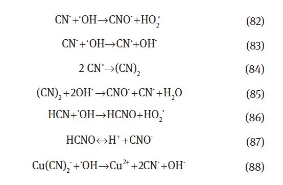 廢水中的氰化物由于具有毒性作用而成為重要的問(wèn)題,通常以氰化氫,陰離子和各種氰化物配合物的形式存在。氣相或水相中的游離氰化物離子(包括氰化物陰離子和氰化氫)是 很劇毒的形式(Dash等,2009)。由于氰化物與臭氧的強(qiáng)烈反應(yīng)性和氰化物的完全消除而不會(huì)產(chǎn)生不希望的副產(chǎn)物,因此各種來(lái)源的氰化物臭氧化前景廣闊。氰化物臭氧化的主要產(chǎn)物是氰酸鹽,可通過(guò)水解或臭氧化過(guò)程進(jìn)一步降解,但是反應(yīng)速度比氰化物的氧化速度慢(Mert等人,2014)。相比之下,臭氧分解產(chǎn)生的˙OH氧化氰化物的方法是通過(guò)以下兩種途徑生產(chǎn)危害較小的中間體CNO [Eq.(82)和Eqs.(83-85)](Gurol and Bremen 1985a)。盡管氰化氫與臭氧的反應(yīng)性較弱,但它很容易被˙OH介導(dǎo)的反應(yīng)降解[Eqs(86–87)]。