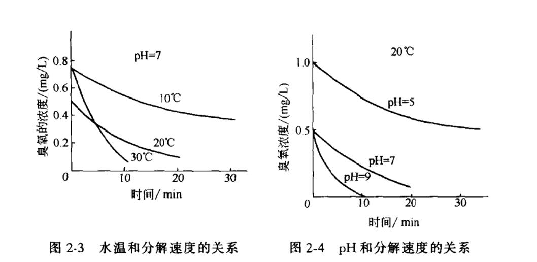 臭氧在水中的分解速度隨水溫和pH值的提高而加快,圖2-3為pH=7時,水溫和分解速度的關(guān)系,圖2-4為20℃時,pH和分解速度的關(guān)系。